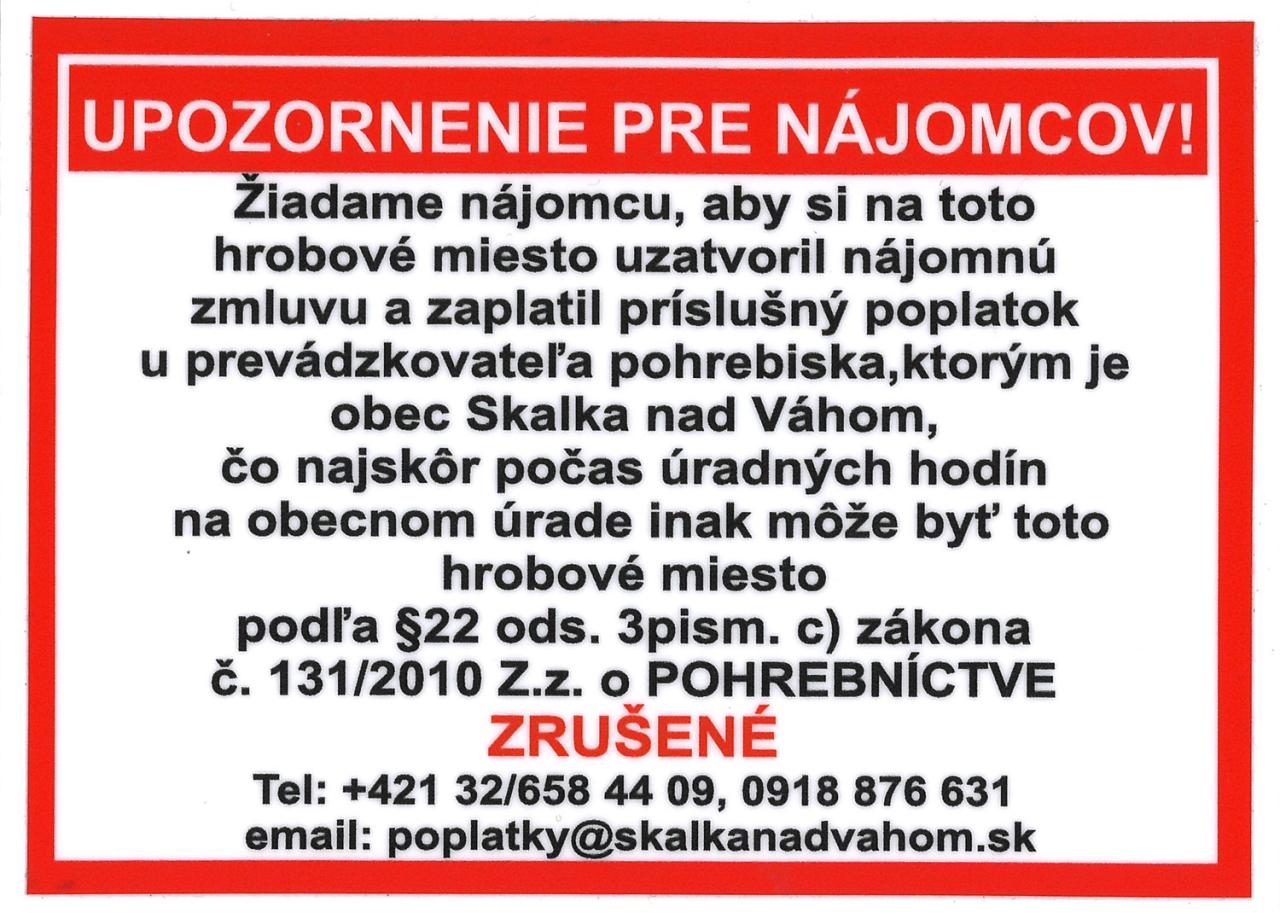 Jedná sa o hrobové miesta, za ktoré nie je zaplatený poplatok. Preto chceme upozorniť občanov, že poplatok je potrebné uhradiť na Obecnom úrade v Skalke nad Váhom počas úradných hodín.